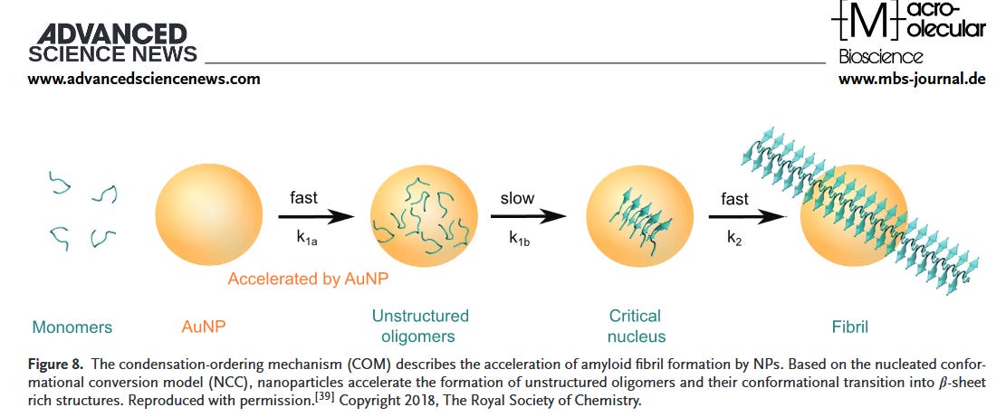 Interestingly, in a nanotechnology study linked below, it shows that nanoparticles can accelerate the growth of Amyloid fibrils on surfaces - which the blood vessels in the body certainly have a lot of surface structure. Metallic nanoparticles have been used to accelerate the self assembly of Amyloid nano and microwires for electronic devices.