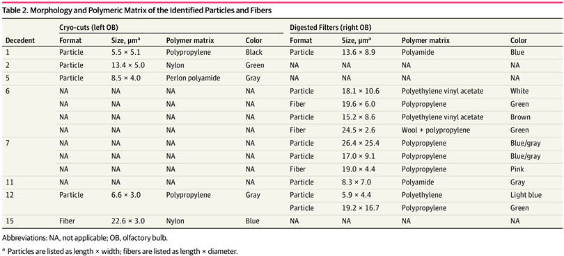 Results The median age of the 15 deceased individuals was 69.5 years, ranging from 33 to 100 years, with 12 males and 3 females. MPs were detected in the olfactory bulbs of 8 out of 15 individuals. A total of 16 synthetic polymer particles and fibers were identified, with 75% being particles and 25% being fibers. The most common polymer detected was polypropylene (43.8%). Sizes of MPs ranged from 5.5 μm to 26.4 μm for particles, and the mean fiber length was 21.4 μm. Polymeric materials were absent in procedural blank and negative control filters, indicating minimal contamination risk.