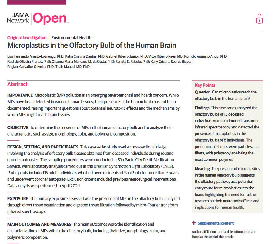 Conclusions and Relevance This case series provides evidence of MPs found in the human olfactory bulb, suggesting a potential pathway for the translocation of MPs to the brain. The findings underscore the need for further research on the health implications of MP exposure, particularly concerning neurotoxicity and the potential for MPs to bypass the blood-brain barrier.