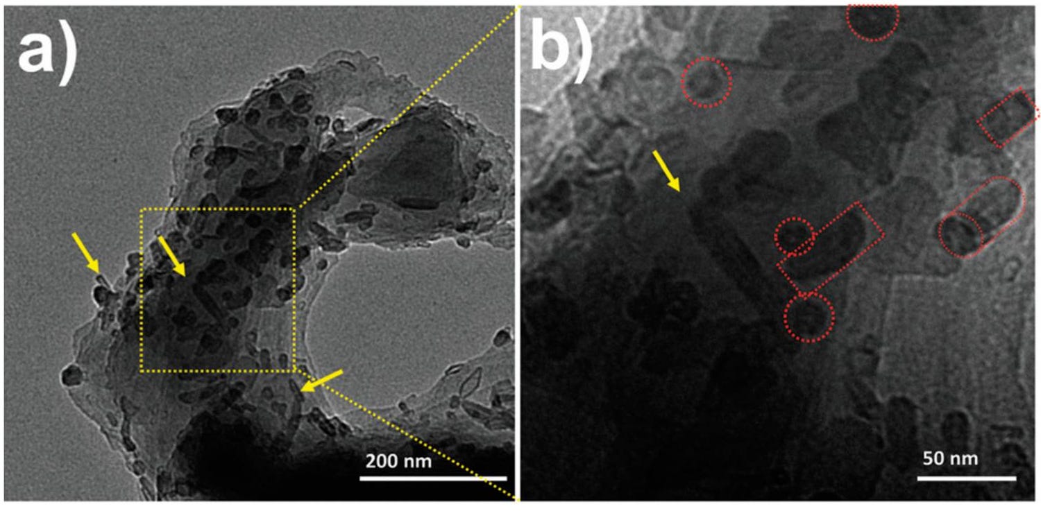 TEM micrograph of polythiophene (PTh)-g-(poly(ethylene glycol) (PEG)-r-biopolymer polycaprolactone (PCL) at (a) low magnification and (b) high magnifications. Porous spherical particles were highlighted with red circles while, rod-like structures are marked with rectangular forms and yellow arrows. Reprinted with permission from reference [96]. Copyright © The Royal Society of Chemistry 2019.